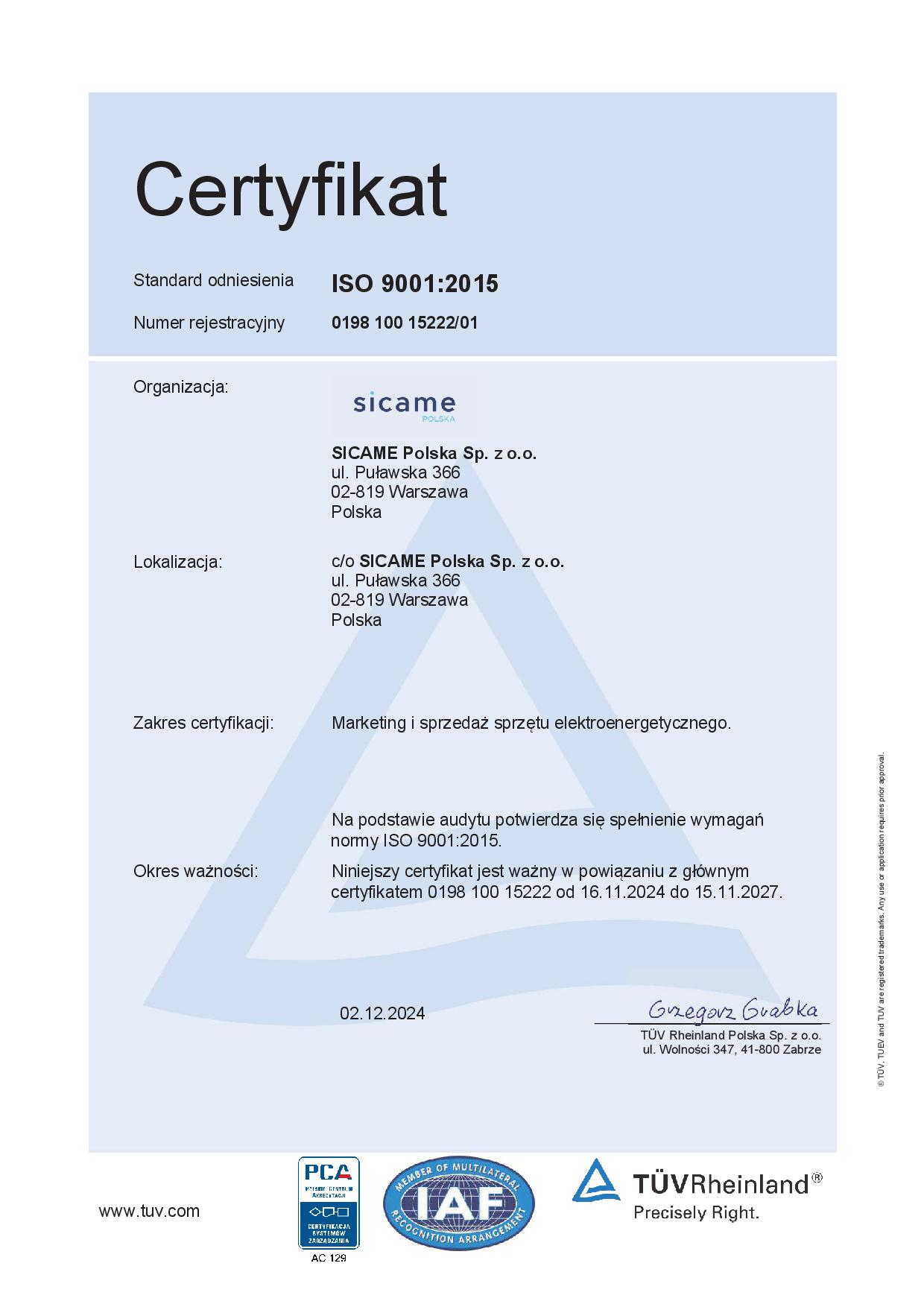 SICAME Polska spełnia wymagania normy PN-EN ISO 9001:2015-10.